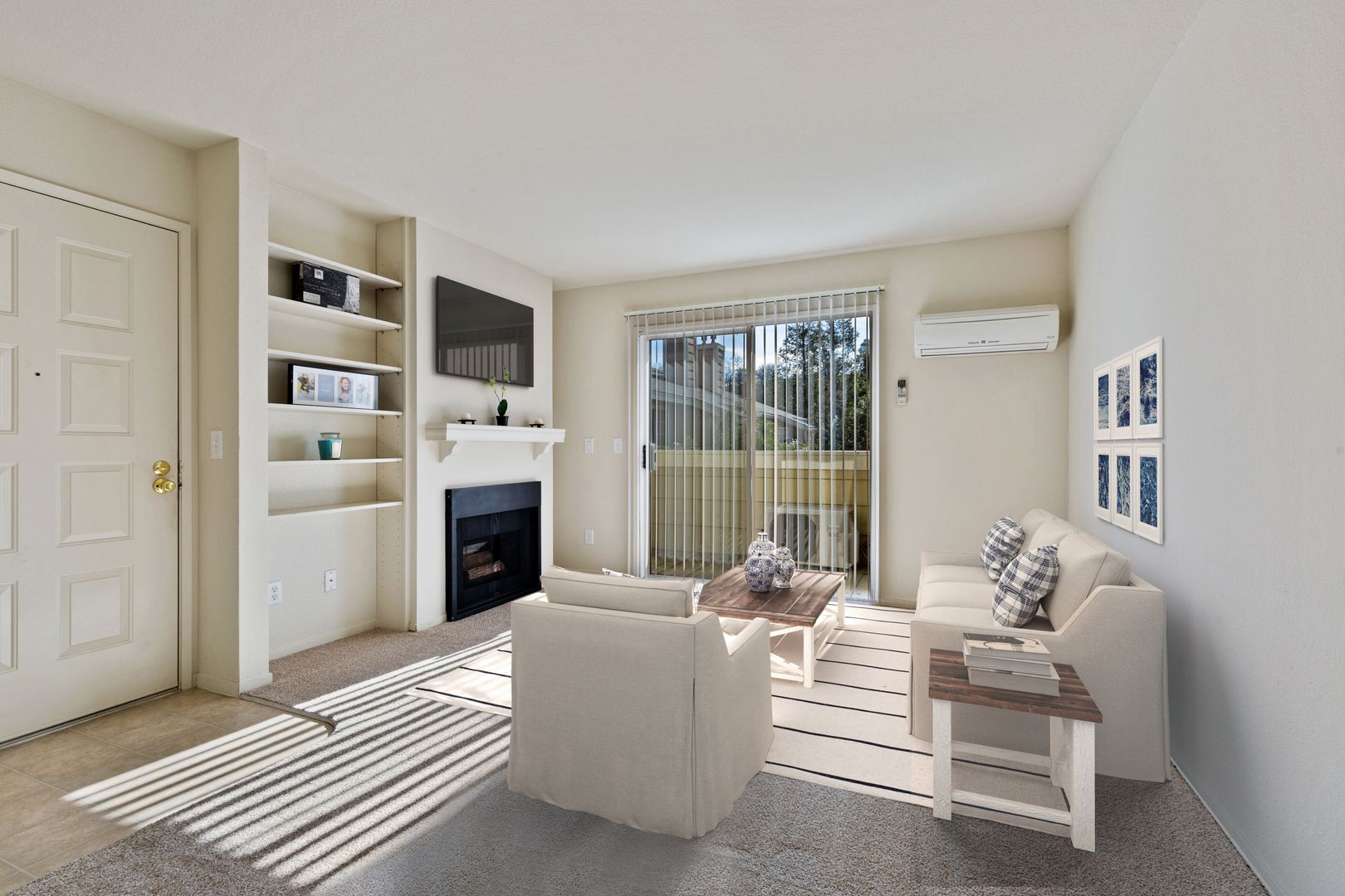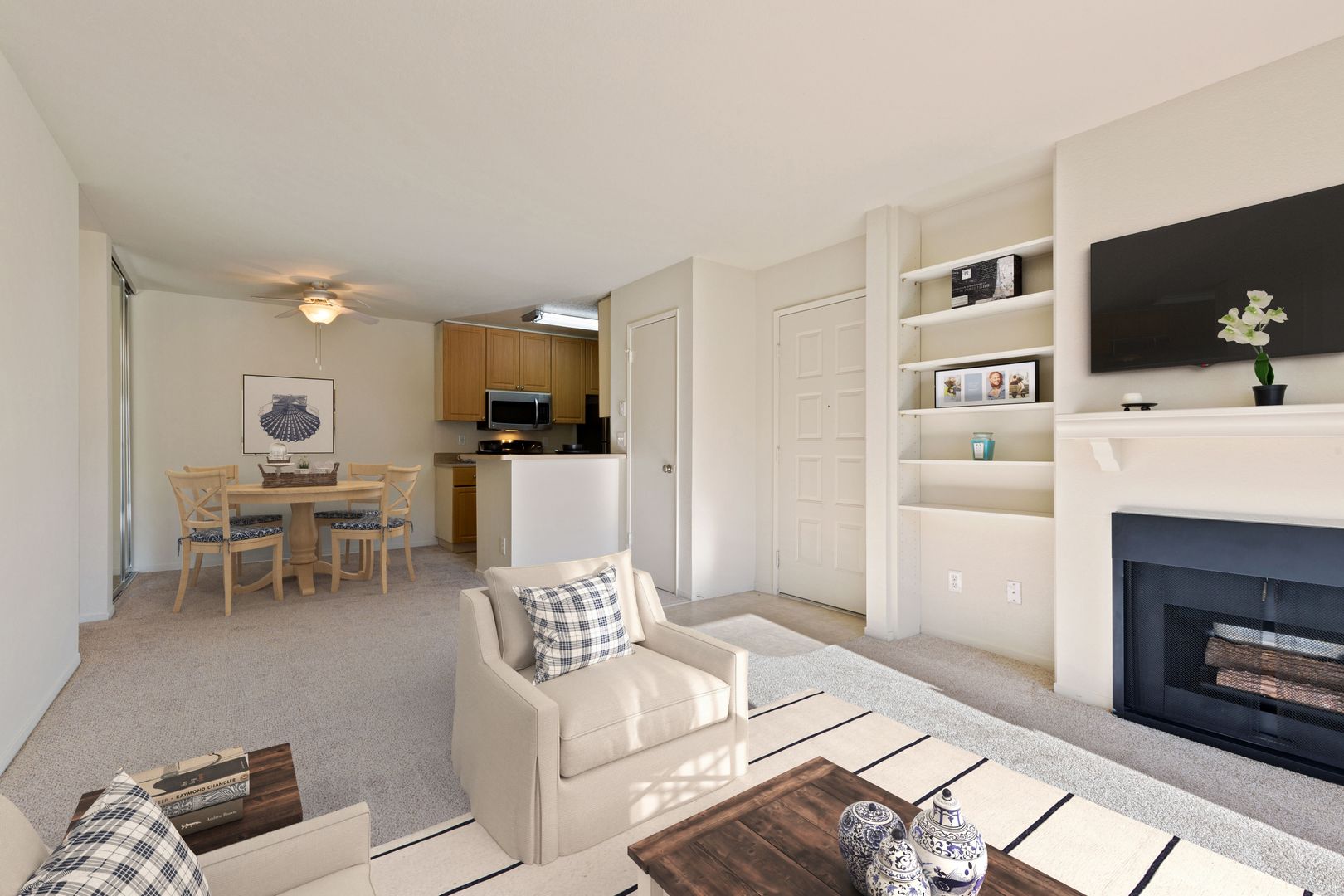• Built-in shelving and easy-to-use gas fireplace at living room